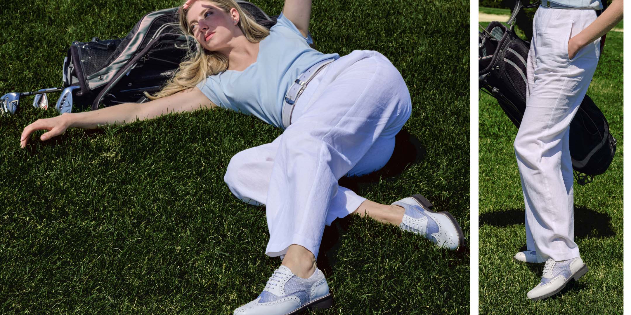 Handgefertigte Golfschuhe aus Vollnarbenleder weiß kokosnussblau