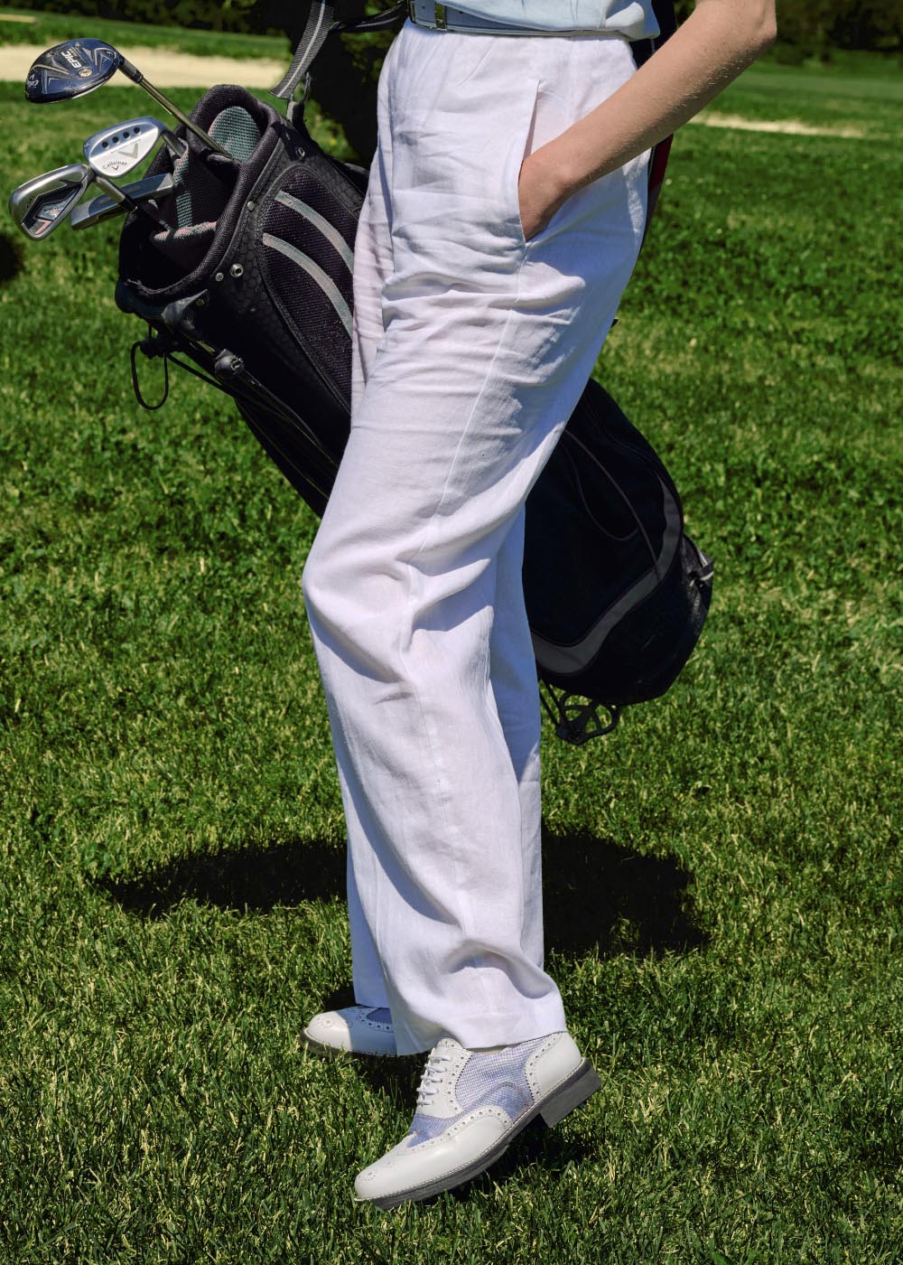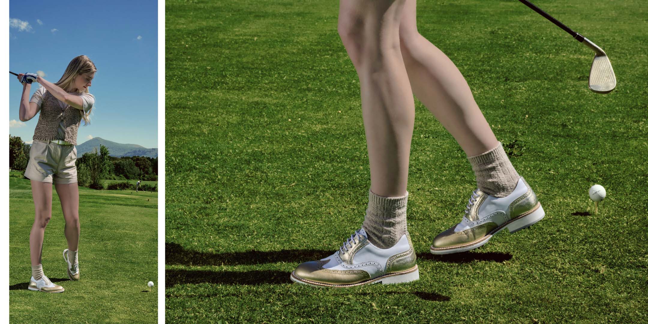 Handgefertigte Golfschuhe aus weißem Leder mit hellbraunen Details