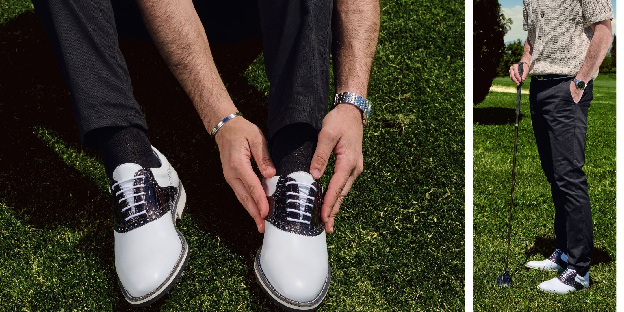 Zweifarbige schwarze und weiße handgefertigte Golfschuhe aus Leder