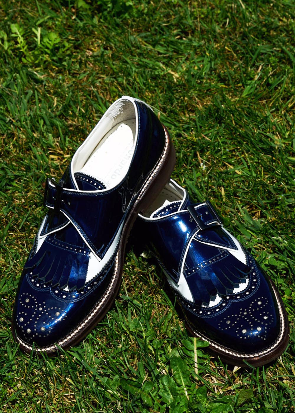 Handgefertigter Brogue aus blauem und weißem Leder