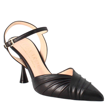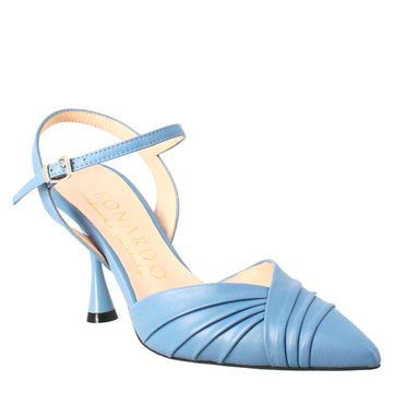 Sandalo chiuso da donna a punta in pelle plissè colore celeste con tacco alto